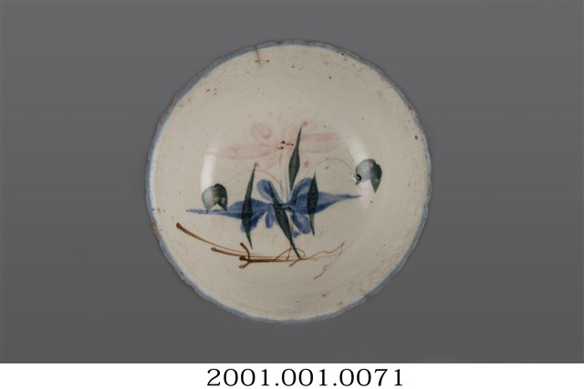 手繪胭脂紅釉花卉紋花口碗以模具成形,高溫燒製,敞口,弧壁下收,底部略作方折,碗底較淺且寬,圈足徑略大,圈足露胎,胎色米白,胎質稍微粗糙。全器施白釉,呈色略帶米色調,釉面光潔,器表略有氣孔及些許雜質。口沿作向外開展的波浪花口狀,口沿施罩一圈淺藍色釉。碗外壁素面無紋,僅以模具印出花瓣般片狀的長條形,但形狀略顯生硬,整件作品由外壁的模印效果看起來像是盛開的花朵造型。主要紋飾以碗內壁的圖案為主,以粉紅、鈷藍釉描繪大朵花卉,並以黛綠釉隨興地描繪不同造型的枝葉。構圖簡單,筆法有力,充滿意趣。