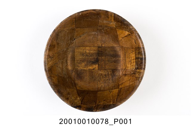 1.木製菱格紋大碗由木質胎模壓成形,薄唇,侈口,口沿略往外捲,斜壁內收至器底,底部平整。器表以條狀木片交疊壓製而成,形成不同木紋、色澤深淺的交錯表現,別有編織器皿的效果。本作品的木紋較深,略帶灰色調。全器在模壓後,再施一層透明釉,使木紋吃釉後表面較為光滑,也可以盛裝液體,不會有木胎濕透的疑慮。2.臺灣的木製碗盤形式多樣化,約從明末便出現。但以本土製造的木製器具而言,約從日據時代才開始,因日本在臺設置木作工廠,開啟風潮。不過,在民國六十年代後漸漸式微,由大量生產的瓷器取而代之。