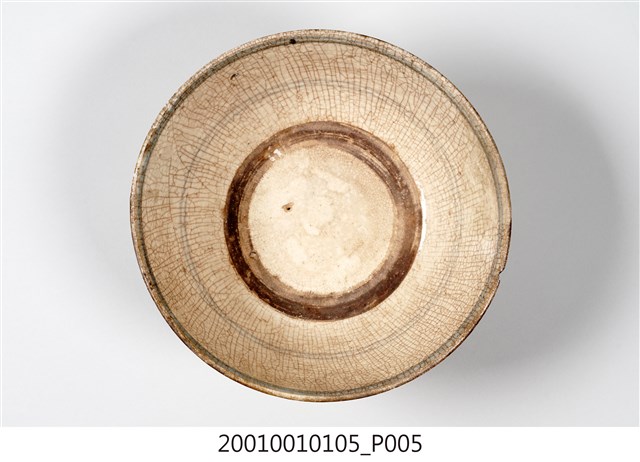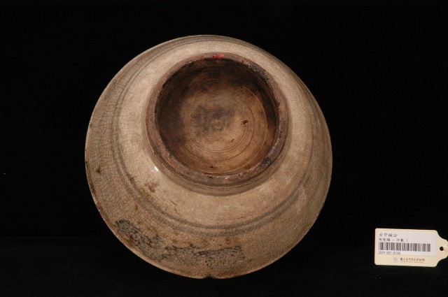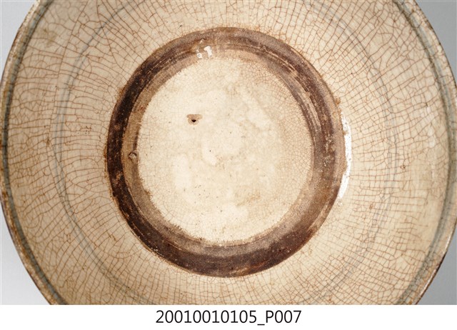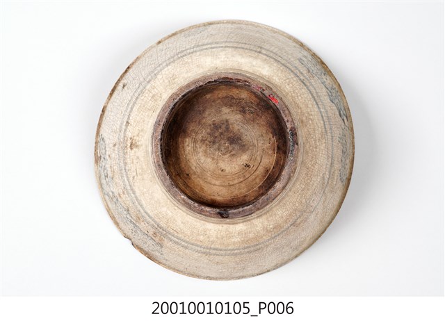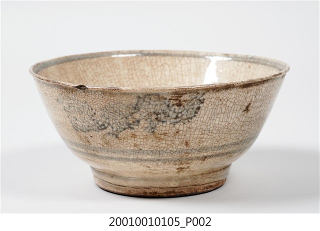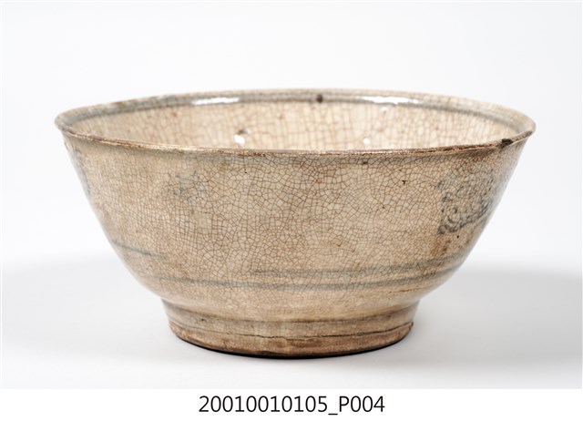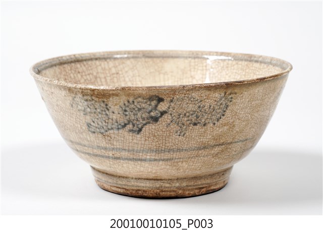 青花印花松葉紋碗公,口徑約24公分,深約11公分,為形制較大的碗公。敞口,口沿略外摺,弧壁下收,底略作方折,底有圈足,碗底心壓印細弦紋,增添造型變化。以模具成形,印青花紋飾再施罩一層透明釉後,以高溫燒製而成。採疊燒技法,碗心一圈刮釉,除外碗底及圈足之外全器施白釉,碗內壁口沿與腹部中央各有二圈青花弦紋,碗外壁一側採印花技法裝飾青花松樹枝葉,器腹下半與圈足飾有二道青花弦紋。此碗應曾被頻繁使用,器表佈滿深褐色細密開片,大部分面積被汙漬痕覆蓋,口沿也有一明顯的碰撞缺角。