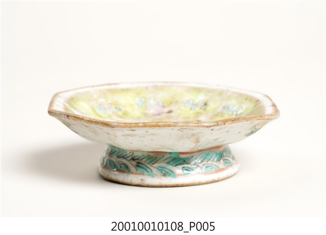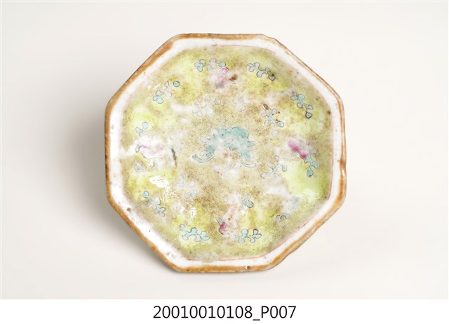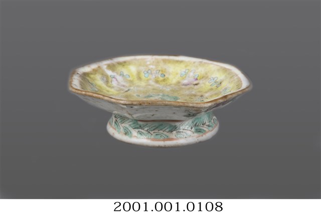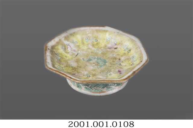1. 黃地花卉紋八角小碗,為東南亞華人社會中常見的娘惹瓷(Nyonya Ware),但品質相對高檔。口呈八角形,口徑約9.2公分,口大底小,碗底寬大,碗身淺,底有圈足,略外闊呈喇叭狀。全器施白釉,表面帶有些許氣孔,口沿描繪金色釉,圈足底露胎,略泛褐色。碗內壁以淺黃釉為地,使用綠色和桃紅色釉刻繪花卉紋樣,釉色多磨損掉落,多被汙漬痕跡覆蓋。碗外壁其中二面以桃紅和黛綠色刻繪簡單花卉紋樣,其餘面積留白。圈足外側繪有螺紋與線條幾何紋飾,塗以黛綠色釉。碗底有一朱色「同治年制」方形落款印,落款的右斜上方點狀刻出一個由「