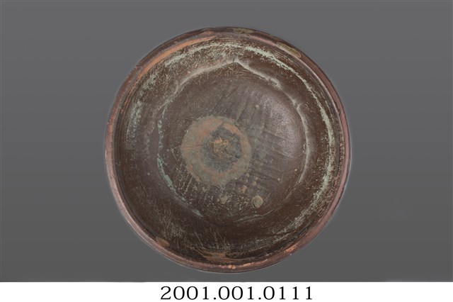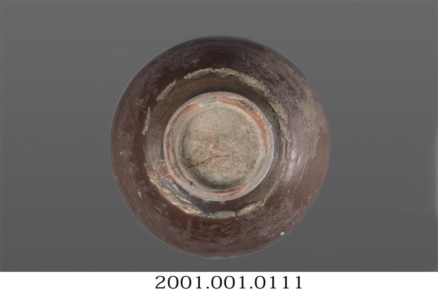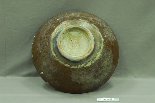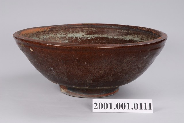 紅褐釉螺旋紋碗,碗身深且寬,口徑約48公分,深約19.1公分,為相當大型的碗。敞口,平唇,圓弧腹,底帶圈足。採疊燒技法,碗心一圈刮釉,圈足與外碗底亦刮釉露胎,胎色磚紅。碗內外壁施紅褐釉,釉厚薄不均,表面可見黑色雜質斑點且有些許自然落灰雜質附著,外碗底有一圈露胎痕跡,應為入窯燒造時二件陶器上下堆疊所致。碗外壁唇下壓印一圈寬環狀橫紋,器腹中央壓印二圈環狀同心圓螺旋狀拍紋,碗內壁素面無紋,表面有許多刮痕,口沿略剝釉,應為使用磨損之故。