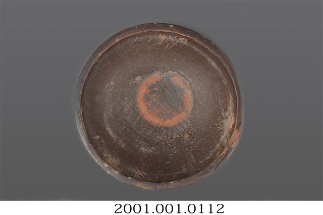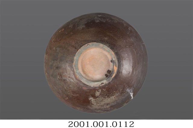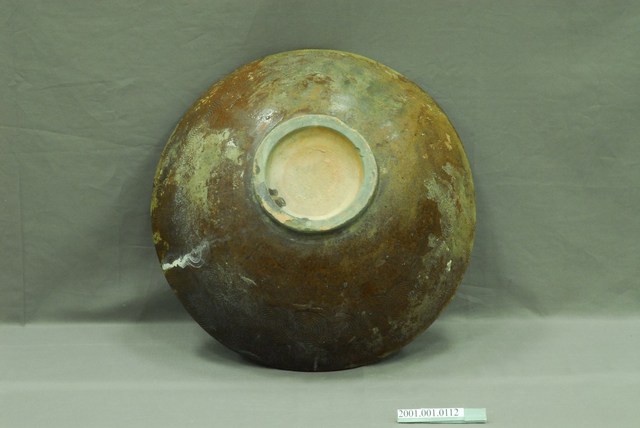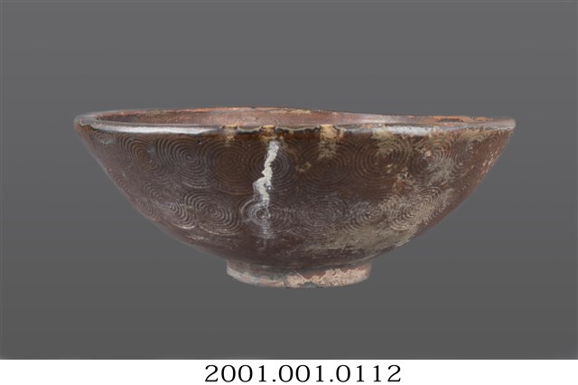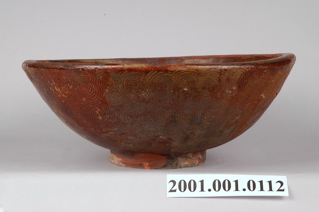 紅褐釉螺旋紋碗,碗身深且寬,口徑約46.5公分,深約18.2公分,為相當大型的碗。敞口,平唇,圓弧腹,底帶圈足,足底寬厚。採疊燒技法,碗心一圈刮釉,圈足與外碗底亦刮釉露胎,胎色磚紅。碗內外壁施紅褐釉,表面可見黑色雜質斑點,口沿一側有五個釉變圓點。碗外壁器腹上半壓印二圈環狀同心圓螺旋狀拍紋,一側有一道明顯的白色條狀痕,碗內壁素面無紋,碗心與緣口有許多刮痕,應為使用磨損之故。
