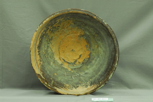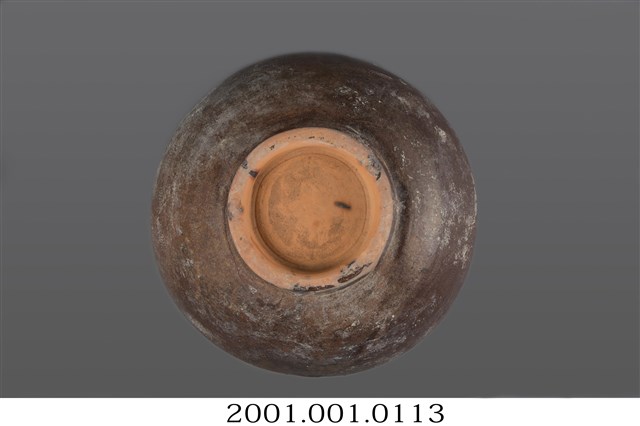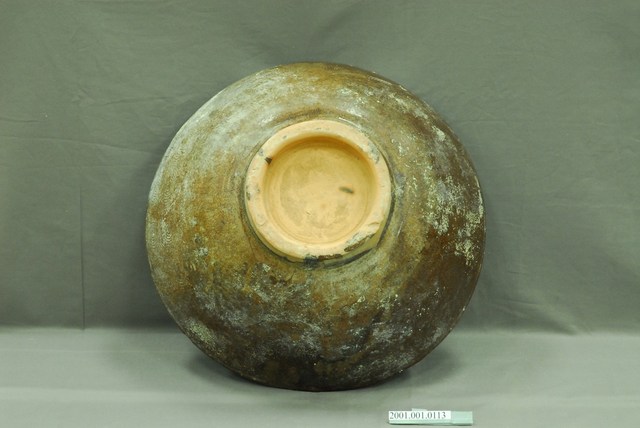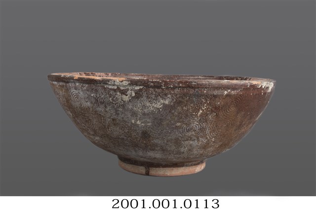 紅褐釉螺旋紋碗,碗身深且寬,口徑約48.3公分,深約20.3公分,為相當大型的碗。敞口,方唇,圓弧腹,底帶圈足,足底寬厚。全器施紅褐釉,表面有大面積自然落灰雜質附著,碗底和圈足露胎,胎色磚紅。碗內壁素面無紋,表面粗糙不平,有許多坑洞,碗心與口緣有大面積露胎,碗外壁唇下壓印一圈寬環狀橫紋,器腹上半壓印二圈環狀同心圓螺旋狀拍紋。