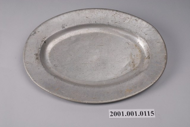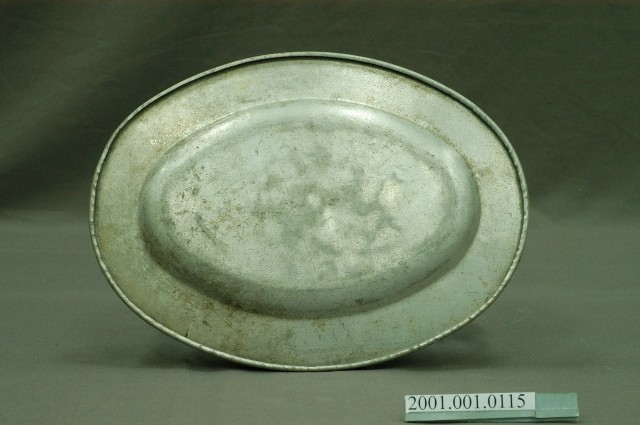 1.鋁製寬折沿橢圓盤圓唇,寬折沿,淺腹,弧壁下斂至器底。全器素面無紋,是由模具將鋁金屬壓製成形。口沿外捲呈圓唇貌,避免銳利的金屬邊緣不好就口。由盤心可略見壓印痕跡。器表有許多經久使用的磨損以及凹陷痕跡。2.臺灣開始製作鋁製生活用品是在日據時期,日本財團於1935年在高雄成立了日本鋁業株式會社,才開始了臺灣鋁工業。日鋁至臺鋁時代所產的鋁製品種類眾多,從日用品至飛機部件皆有,是臺灣工業化的重地之一。