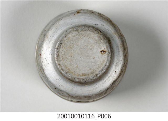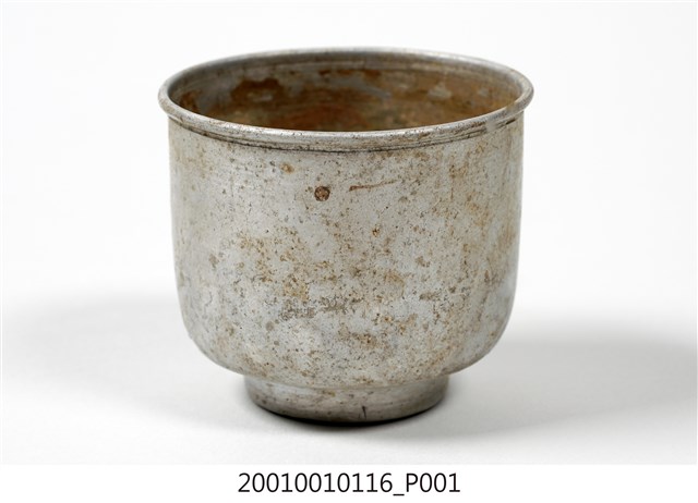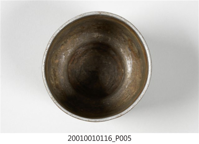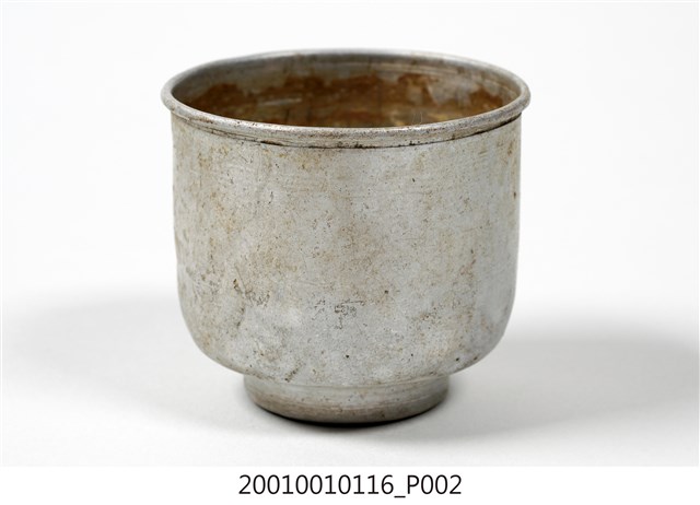 1.本件鋁製茶杯以鋁片一體成形製作,呈長6.5公分,寬6.6公分,高5.7公分之圓筒形。外觀呈現霧面銀灰色,器身呈圓柱形,口緣處向外拗折作唇。器身與器底交界處作圓弧形轉折內縮,器底呈圓形作假圈足樣式。2.茶杯外表帶有一道一道之同心圓痕跡,為使用旋壓機械製作時,遺留下的製作痕跡。製作時將圓形鋁片與金屬模具一同夾入旋壓機中,使之高速旋轉,再以金屬長棒於鋁片外側施加壓力,使鋁片逐漸貼合模具,即可製作成符合模具的器皿。