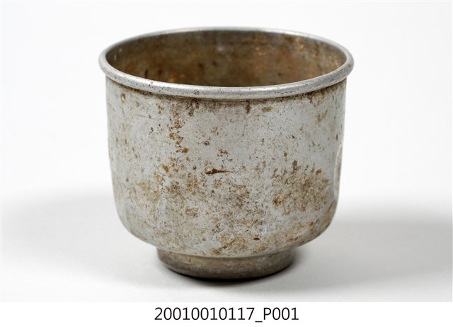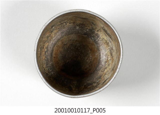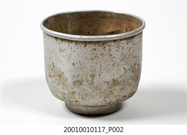 1.本件鋁製茶杯以鋁片一體成形製作,呈長6.6公分,寬6.7公分,高5.7公分之圓筒形。外觀呈現霧面銀灰色,器身呈圓柱形,口緣處向外拗折作唇。器身與器底交界處作圓弧形轉折內縮,器底呈圓形作假圈足樣式。2.茶杯外表帶有一道一道之同心圓痕跡,為使用旋壓機械製作時,遺留下的製作痕跡。製作時將圓形鋁片與金屬模具一同夾入旋壓機中,使之高速旋轉,再以金屬長棒於鋁片外側施加壓力,使鋁片逐漸貼合模具,即可製作成符合模具的器皿。
