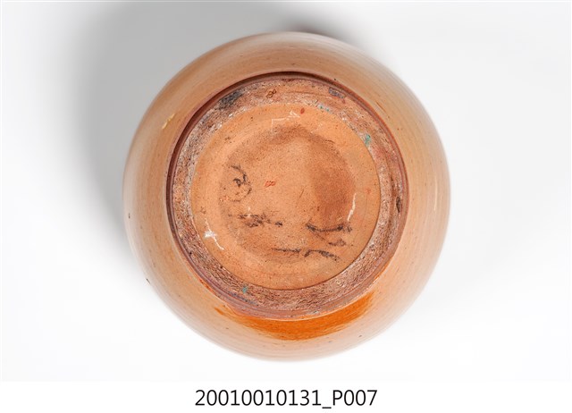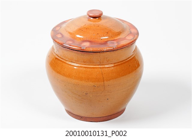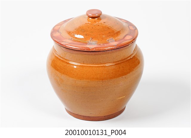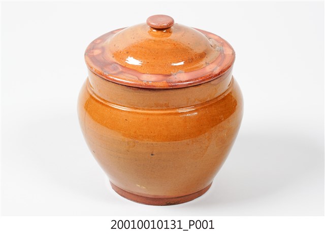 1. 紅陶鹽罐由紅陶高溫燒製而成,全器施透明釉,器表極富光澤且平滑。本件陶罐帶有蓋,由釉色、胎色判斷,應是原始便附有的蓋子。本罐口沿沒有做防蟻槽,可能是用於存放較不怕螞蟻的調味料,如鹽等。2. 臺灣早期十分常見此種帶蓋形式的陶罐,尺寸有大有小,陶罐的樣式也非常多變。尺寸較小者多用於儲存糖、鹽等廚房常用的調味料,尺寸較大者則多用於存放米、酒、醃菜等食物。陶罐是民間十分重要的日用陶瓷,因此許多窯廠皆有燒製此種用器。