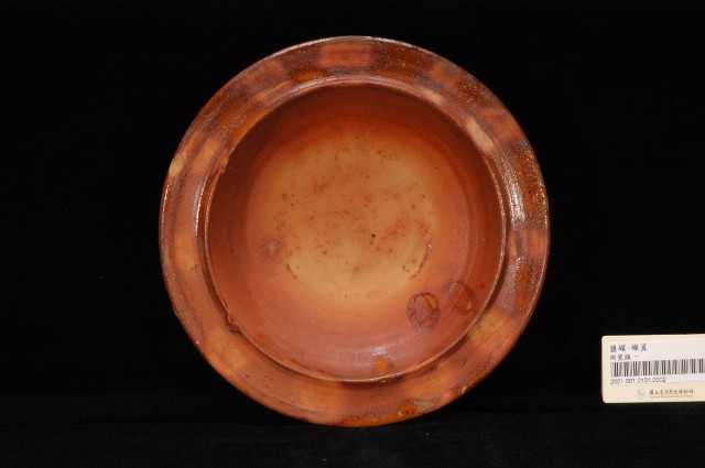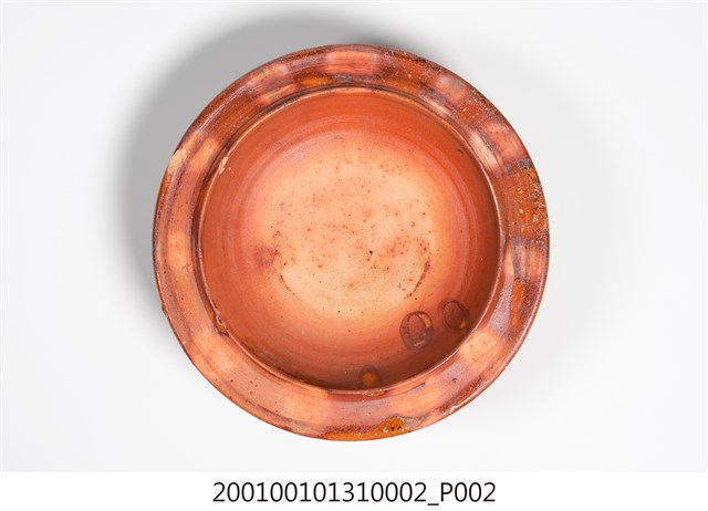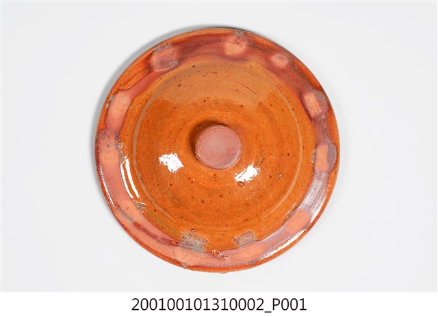 1.紅陶鹽罐罐蓋由紅陶高溫燒製而成,蓋面微凸起,頂端有一具有厚度的平紐,方便握取。蓋面邊緣較平,圓唇。蓋背做圈足,能與罐身口沿密合。蓋面施透明釉,但平紐與蓋緣處皆有點狀的脫釉痕跡,蓋背大部分沒有施釉,僅口沿處略有流釉痕跡。點狀脫釉痕跡應是墊燒時的墊圈遺留的痕跡,為節省窯燒空間而使用的燒製方式。