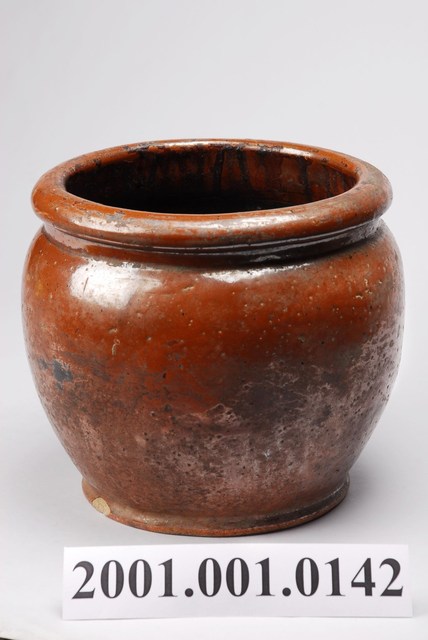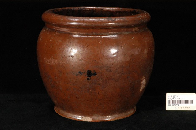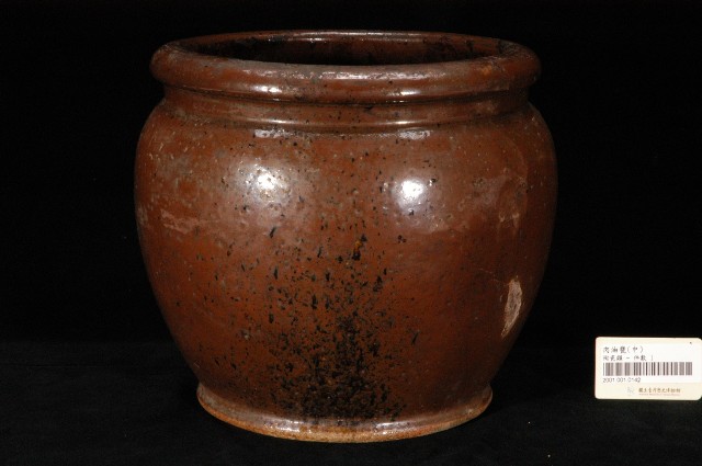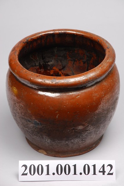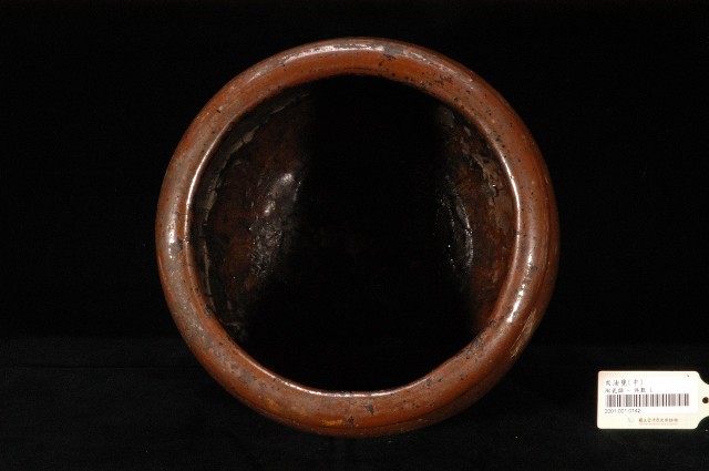 1.褐紅釉素面油罐,廣口,圓唇,直頸內縮,圓弧壁,底部略收,平底。全器施褐紅色釉,釉厚薄不均,部分剝釉露出灰褐胎色,外器壁腹部中央有一明顯黑色斑點,另一面則有一片密密麻麻的黑色斑點,底座有一處碰撞剝落的凹痕,內器壁上方有黑色油漬痕跡。2.陶罐器形與陶甕相似,形制較小且高度與寬度相近,通常用來呈裝油、鹽、糖等用量較少的日用品,常依其用途來命名,廣口的陶罐也適合用來醃漬醬菜。