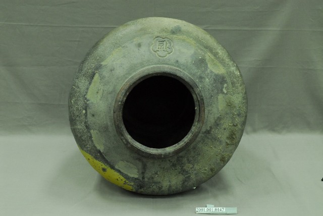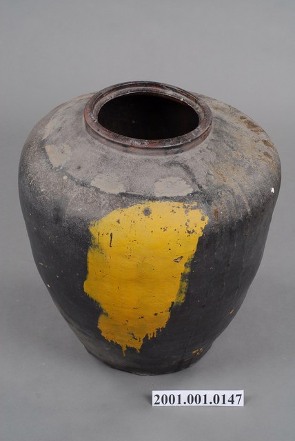 素燒黑色素面酒甕,圓口,扁尖唇,口內緣內縮形成一凹槽,短頸內縮,斜肩,圓弧壁,平底,全器最大寬度在肩腹交接處,向下斜收至底部,呈心形。單肩明顯凹陷,此因為上層陶器過重,燒製時無法負荷重量所致。肩部有一圈明顯接痕,上面有間隔相等距離有無釉淺紅褐色小圓圈,為入窯燒製時上下兩件陶器堆疊,用「泥餅」隔開的痕跡。全器保持素面無紋,器肩上有一鮮明的梅花與「酒」字紋樣。施褐色釉,釉厚薄不均,部分剝釉,肩部至腹部有一大片黃色痕跡。