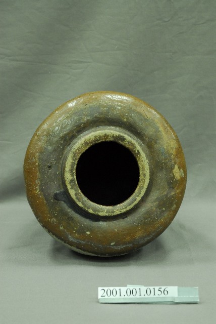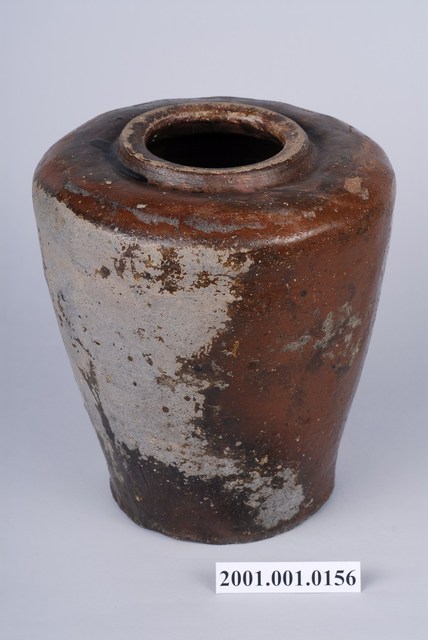 1.褐紅釉素面豆菜甕,圓口,短頸,平肩,全器最大寬度在肩部,向下斜收至底部,呈倒三角形。外器壁施褐紅色釉,釉厚薄不均,可見一整片外施釉部分,露出灰褐胎色,部分因燒製火候控制不均,呈現黑色。2.此類形的陶甕形制較小,高度與寬度相近,也稱作「陶罐」,用途不定,可以用來呈裝油、鹽、糖等日用品,或用來醃漬醬菜,常依其用途來命名。