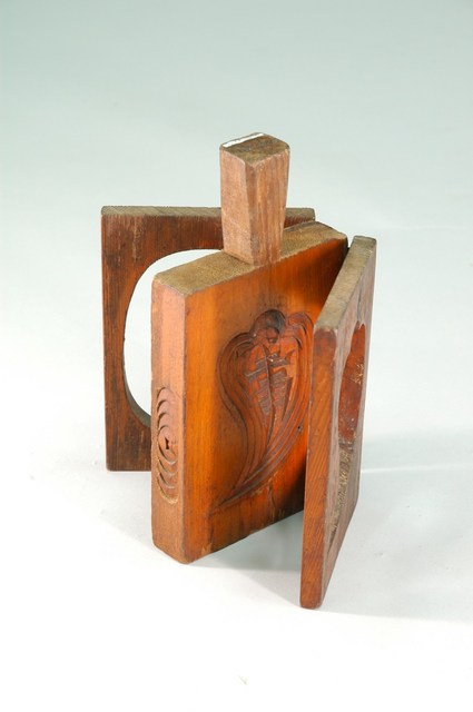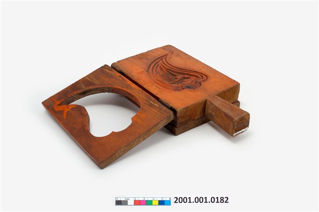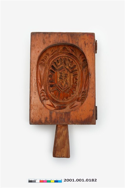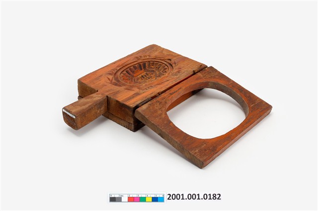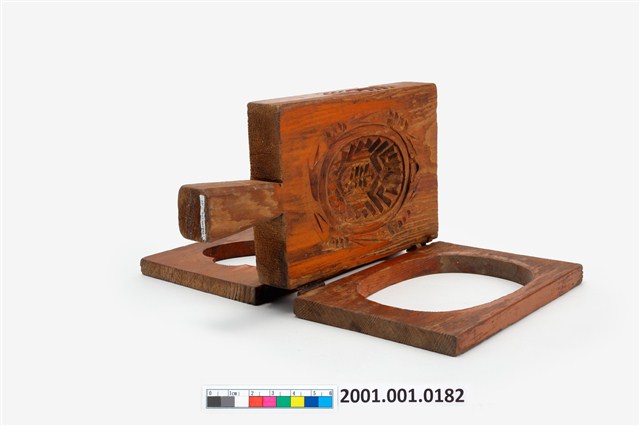 2001.001.0182 長方形三面雕龜桃連錢紋帶柄粿印
