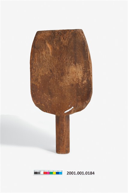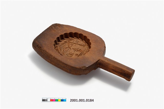 2001.001.0184 酒瓶形單面雕椰樹太陽帆船紋帶柄餅印