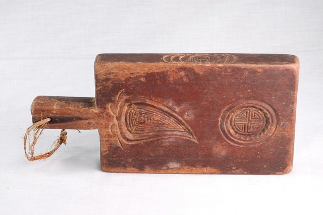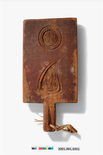 2001.001.0201 朱漆長方形三面雕龜桃銀圓連錢紋帶柄粿印