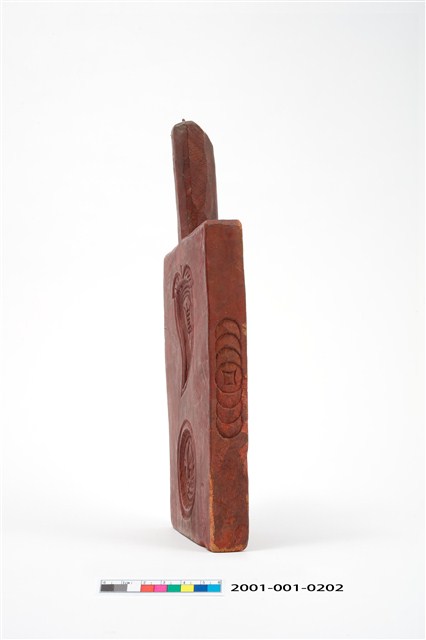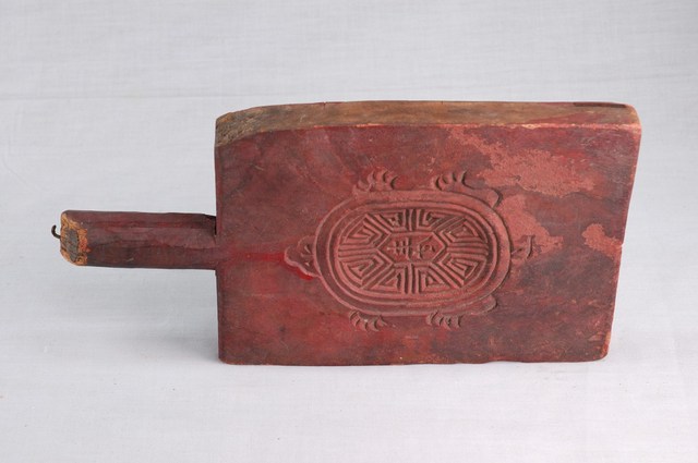 2001.001.0202 朱漆長方形三面雕龜桃銀圓連錢紋帶柄粿印