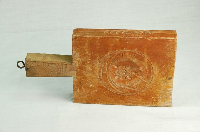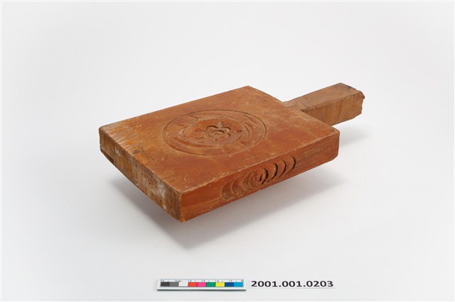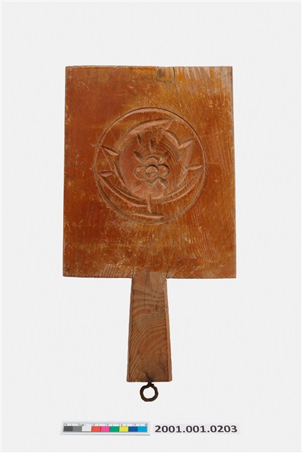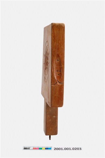 2001.001.0203 朱漆長方形四面雕龜桃連錢魚紋帶柄粿印