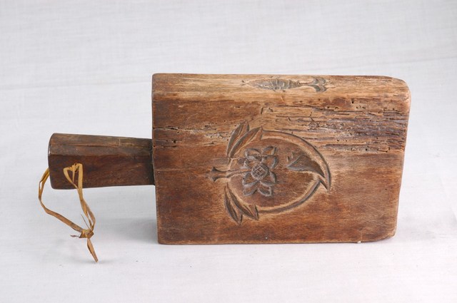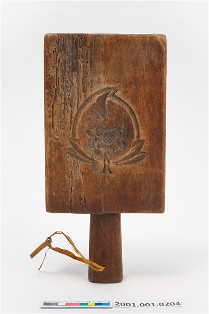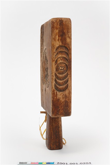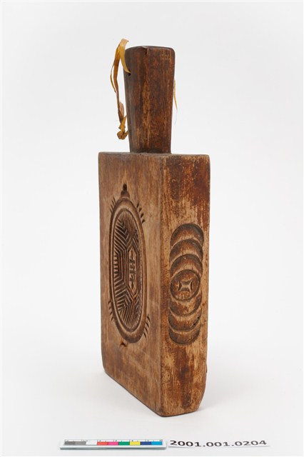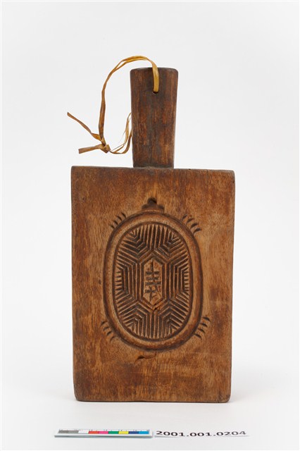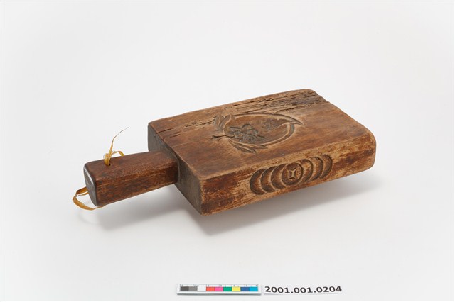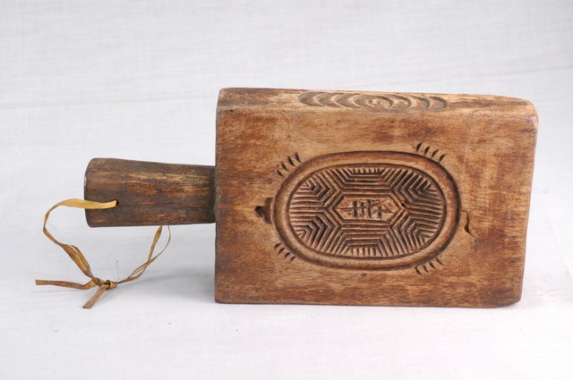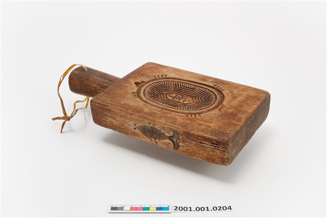 2001.001.0204 長方形四面雕龜桃連錢魚紋帶柄粿印