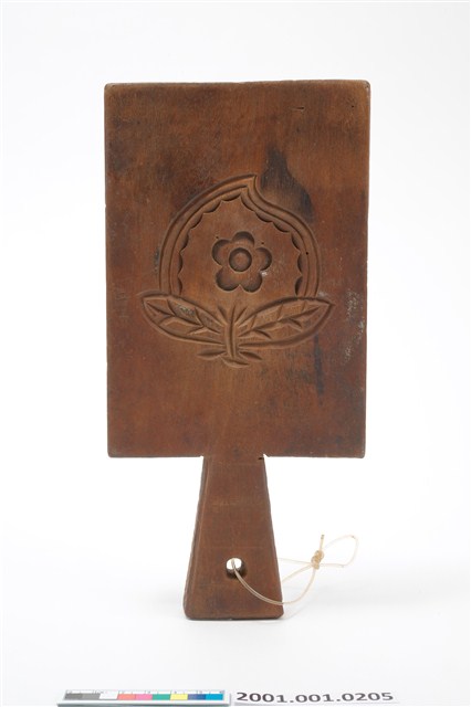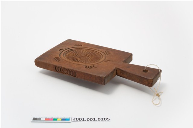 2001.001.0205 長方形四面雕龜桃連錢魚紋帶柄粿印