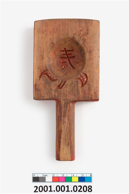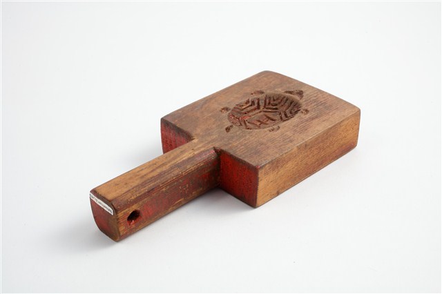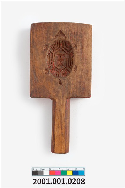 2001.001.0208 朱漆長方形雙面雕龜桃紋帶柄粿印