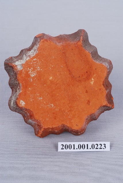 1.不規則形單面雕佛手紋紅磚燒粿印,長8.2cm、寬 8.5cm、高1.9cm,呈磚紅色,壓印的頂部面較寬,底部較窄,側邊由上至下呈現內縮斜角狀。壓印處中央淺雕一佛手紋,外緣部分有少許減地處理,使壓印面呈現稍微凸出狀。此物件整體佈滿白色斑點色塊,壓印面部分邊緣處有些許凹缺,推測為頻繁使用後所造成的現象。2. 因「佛手」具辟邪意義,加上音近「福壽」,象徵吉祥納福,故而成為臺灣民間常見的吉祥紋飾。此類磚燒粿印為早昔燒磚瓦業者生產,以較細緻磚土低溫燒製成形;雖然價格較為低廉,但因厚實沉重不易執握,容易因碰撞破