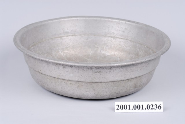 1.本件鋁製臉盆,臺語又稱面桶。通身以鋁合金製作而成,外型呈上寬逐漸下窄之圓形深盆狀,口部折沿,邊緣帶有內捲圓唇。器身中段處帶有一道轉折線,底部呈平底帶有圓環型底圈足。其外觀呈現金屬灰色,並帶有鋁金屬氧化過後的斑痕。2.臉盆主要做為衛生盥洗,裝盛清水用於清洗臉部與手部。其材質多見於木製、銅製、搪瓷等,傳統常見與臉盆架做搭配。鋁製臉盆常見於臺灣常民生活,其用途廣泛除原本盥洗之用,也常用於清洗或裝盛物品使用。