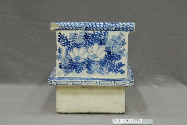 1.本件為青花便池,器長51.6公分,寬27.2公分,高28.7公分,器形為方形,器身裝飾花草紋及似回紋飾樣。青花瓷器是使用含氧化鈷之礦物為顏料,將紋飾畫在白色瓷胚上,燒出白底藍色圖案的釉下彩瓷器。2. 臺灣在日本殖民政府推動現代衛生政策後,開始出現新式衛生用陶瓷,日製高級衛生用瓷也相繼輸入。臺灣日治早期的高級便器大多來自日本,為高消費力的族群使用,之後臺灣本地窯業也開始仿燒。