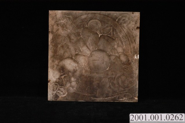本件磁磚底色為淺綠色,圖案為褐色藤編圓底提籃,提籃柄上繫綠色緞帶,籃內裝臺灣特產水果鳳梨、香蕉、枇杷,及吉祥圖案的桃子(長壽),以及西方常見的水果蘋果、西洋梨、葡萄等,提籃外放置栗子、英國最常使用的玫瑰,結合中西圖案,應屬日產紋樣,即由日本所設計的創新圖案,與館藏號2001.001.0263為相同的圖案與色彩。本件磁磚背面未做特殊紋路,僅因正面胚紋形成反向凹凸效果,此種做法不見於英國製或印度製磁磚,推測為日製。