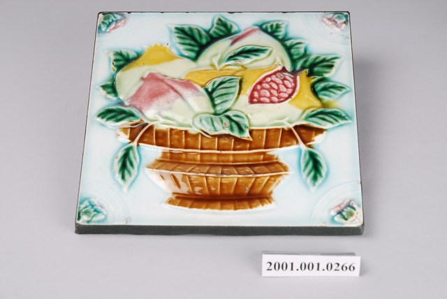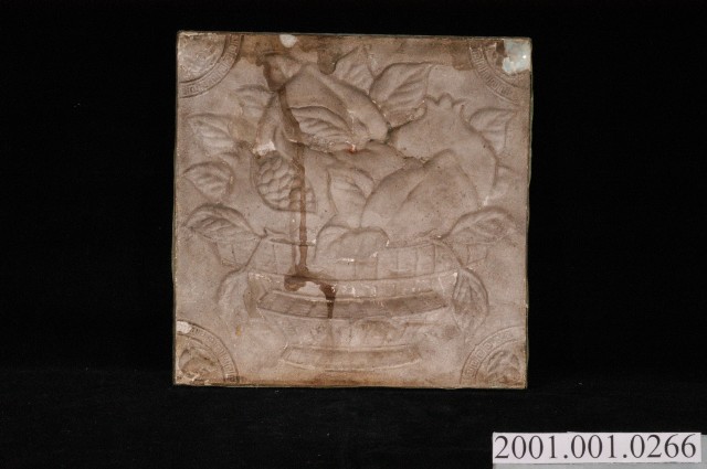 本件磁磚底色為白色,圖案為褐色藤編高腳水果盤,盤內裝吉祥圖案的桃子(長壽)、石榴(多子),以傳統圖案為主題,四角則為西方的康乃馨及回紋構成弧形,結合中西圖案,應屬日產紋樣,即由日本所設計的創新圖案。本件磁磚邊緣釉色有少許點狀剝落,與館藏號2001.001.0267為相同的色彩與圖案。本件磁磚背面未做特殊紋路,僅因正面胚紋形成反向凹凸效果,此種做法不見於英國製或印度製磁磚,推測為日製。