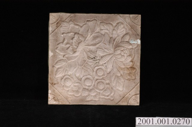 本件磁磚底色為白色,主要圖案為梅花(報春)、菊(長壽)、牡丹(富貴),屬中國傳統吉祥紋樣類型。四角則為綠色和黑色構成的幾何圖案,為英國維多利亞磁磚常用的圖案。本件磁磚背面未做特殊紋路,僅因正面胚紋形成反向凹凸效果,此種做法不見於英國製或印度製磁磚,推測為日製。