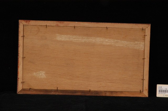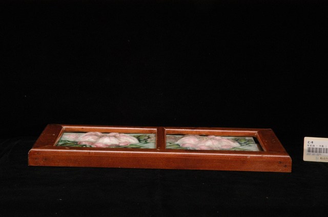本件文物為兩片相同圖案的馬約利卡磁磚,後以木框框起,木框為收藏者所後加。馬約利卡磁磚(Majolica Tile),臺灣稱為彩磁,是一種彩繪錫釉磁磚,使用乾黏土,以機器壓胚,人工上釉彩後燒製而成,上彩的方式有手繪、浮雕、轉印、Tube Lining等技法,本件為Tube Lining技法。臺灣引入的馬約利卡磁磚尺寸大多為6吋x6吋,亦有6吋x3吋、3吋x3吋等,本件為6x6吋。本件磁磚底色為白色,圖案為牡丹(富貴),屬中國傳統吉祥紋樣類型。與本磁磚相同的主題、構圖與風格可見於確定為日製的磁磚,推測本磁磚為日製的可能性較大。