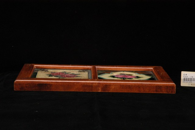本件文物為兩片不同玫瑰圖案的馬約利卡磁磚,後以木框框起,木框為收藏者所後加。本件磁磚圖案皆是英國維多利亞磁磚圖案,可能為英國製,或印度、日本仿英國圖案所製。馬約利卡磁磚,臺灣稱為彩磁,是一種彩繪錫釉磁磚,使用乾黏土,以機器壓胚,人工上釉彩後燒製而成,上彩的方式有手繪、浮雕、轉印、Tube Lining等技法,本件為Tube Lining技法。臺灣引入的馬約利卡磁磚尺寸大多為6吋x6吋,亦有6吋x3吋、3吋x3吋等,本件為6x6吋。本件磁磚其一底紋以綠色抽象樹形圖案層層排列而成,中間底色為白色,邊框為綠色四瓣花圖案,核心是兩朵玫瑰。其二以綠色框邊,四角葉紋,中間底色為白色,中央圖案為兩朵玫瑰。玫瑰是英國維多利亞磁磚最常用的題材。
