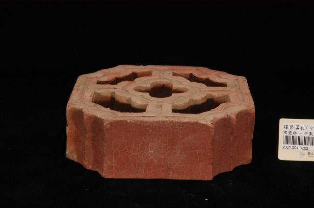 本件文物為素燒花磚,又稱鏤空花磚、素胎花磚、花磚、花窗,鏤空具透氣效果,通常作為漢式傳統廟宇或民居的氣窗使用,因此又稱花窗。也常成排並列,作為圍牆的裝飾。花磚為模具素燒紅磚,自清末至今皆有燒製。本件中央為柿蒂紋,向四邊十字延伸將圖案切割成四塊,四邊切角使花磚呈八角形,兩面皆有陰刻線條。