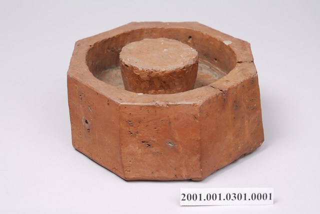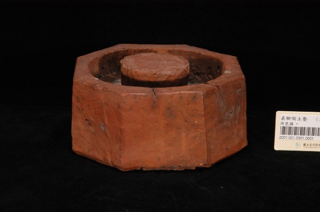 本藏品為無釉紅陶桌腳墊一對之一,長14.9cm、寬15.4cm、高6.9cm,通體素燒不加釉,胎土緻密,質似紅磚,顯然土料經過多次淘洗。外壁外為八角內為圓形,內部凸起為圓柱形,器面並不規整並有多處裂縫孔洞。除造型外無其他裝飾,是強調實用之器。