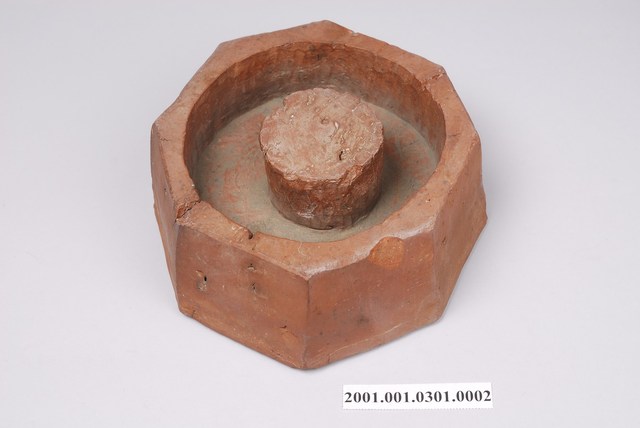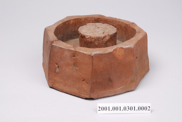 本藏品為無釉紅陶桌腳墊一對之一,長15.7cm、寬15.cm、高6.7cm,通體素燒不加釉,胎土緻密,質似紅磚,顯然土料經過多次淘洗。外壁外為八角內為圓形,內部凸起為圓柱形,器面並不規整並有多處裂縫孔洞。除造型外無其他裝飾,是強調實用之器。