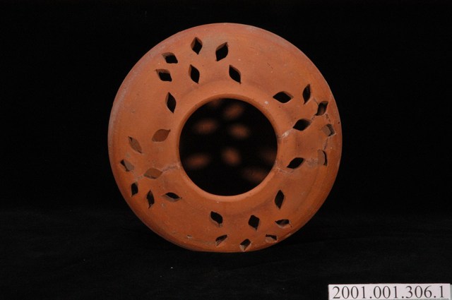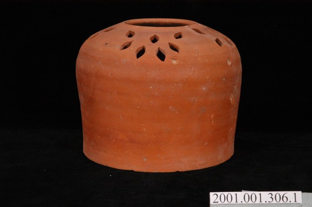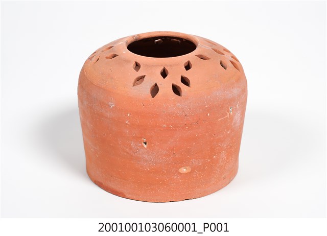 1.此為磚燒花草紋附蓋火籠之器身,長約19.4公分,寬約19.3公分,高約15.3公分。此火籠器身以素陶拉坯製成,未上釉,器頂為圓形窄口,外拉至肩部呈圓弧狀,透鑿四組花草紋飾以利通風。器身中段至底部成圓柱狀,無外顯圈足。火籠整體有多處斑駁及白點。2.火籠可裝盛木炭作祛寒取暖用。臺灣多稱火籠、火爐、烘爐,日本則稱為火缽(ひばち,Hibachi)。臺灣以紅磚燒製器具,最早可追溯至荷西、明鄭時期。