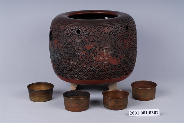 1.飛天雲紋陶製火缽組,包含:缽體、缽架和四個銅杯。缽體為陶製,圓桶形,施紅褐色釉,外器壁飾有雲紋、松葉、飛天和富士山紋樣。缽架由灰褐色胎土製成,扁圓形,有二足。銅杯為圓形,平底,杯身上寬下窄,口沿外緣有一圈環狀突起。2.火缽為冬天取暖的用品,在臺灣多稱為「火爐」,日本人稱為「火缽」,通常是圓形的陶盆。天冷時,將燒紅的木炭放置其中,烤火取暖。
