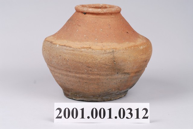 1. 紅陶素燒折肩甕圓口,圓唇,唇口下方略向內凹,頸部較長且線條外張,連接至器肩。全器最大徑在肩腹交接處,器身斜壁下收至圈足,平底,器底邊緣向內收,頗具圈足般的效果。全器手拉成形,唇口與腹部皆有不平整的痕跡,是手拉胚的特色之一,別具古樸風味。全器素燒無上釉,但由胎色分佈可見因窯燒時間造成的胎色不均,上半部略帶灰,下半部較紅。2.這類素燒陶罐因為沒有上釉作為液體的防漏層,功能多半用於燒煮,可以直接接觸火源加熱。