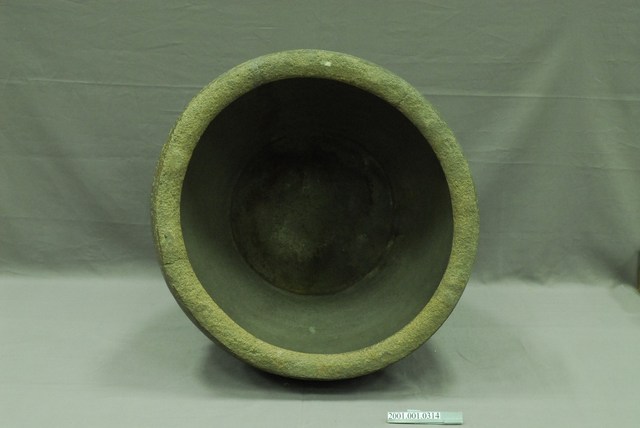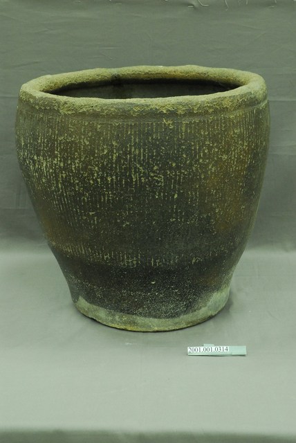 素燒褐紅直紋水缸,廣口,圓弧腹,平底,全器最大寬度在肩部,向下逐漸內收至底部。外器壁緣口處壓印一圈橫線,橫線以下由肩部至腹部約2/3面積壓印直紋,近底部的1/3為素面無紋,側面可見一條由上而下的裂縫。全器無釉,呈褐紅胎色,部分因燒製火候控制不均,呈現黑色。