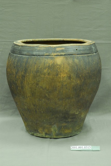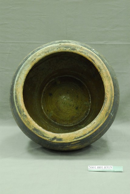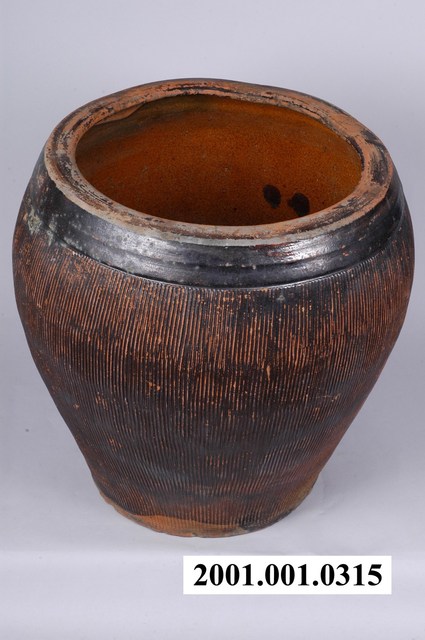 褐紅釉直紋水缸,廣口,圓弧腹,平底,全器最大寬度在肩部,向下逐漸內收至底部。外器壁緣口處壓印一圈橫線,橫線以下由肩部至底部壓印細密直紋。全器施褐紅色釉,外器壁的緣口及器腹部分地方因燒製呈現黑色,內器壁有二顆黑色圓形斑點。