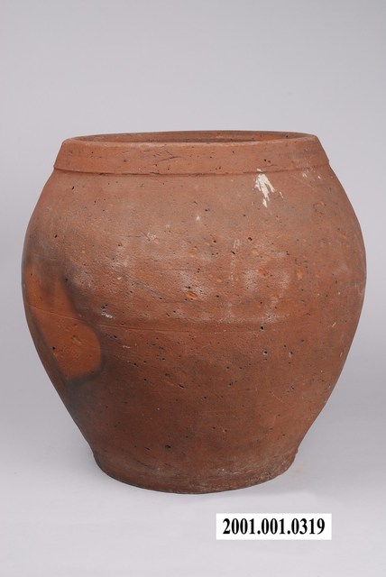 素面磚燒甕,廣口,口部下方壓印一圈凹痕,圓腹,器身最寬處為於腹部偏上方,逐漸向底部收小,器底扁平。全器無釉,呈磚紅色,外器壁依稀可見七道細橫紋壓痕,腹部有一塊黑灰色不規則燒痕,近緣口處有一部規則白色色塊,器身表面粗糙,佈滿小坑洞。本件形制較小,為小型的水缸,亦可作米缸使用。