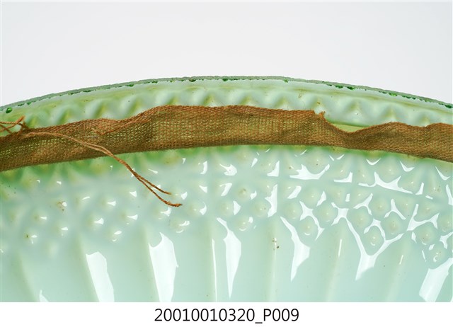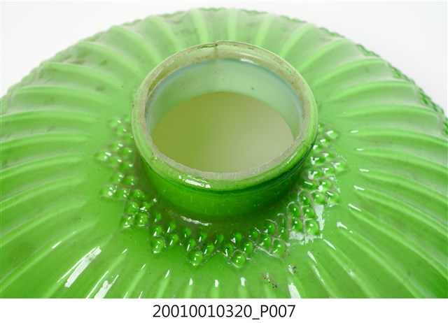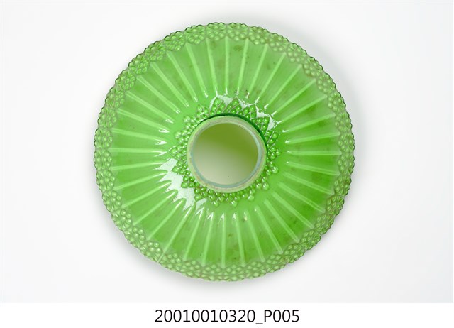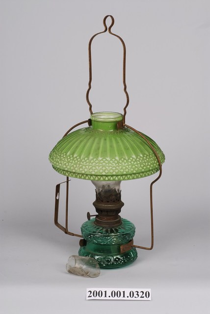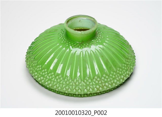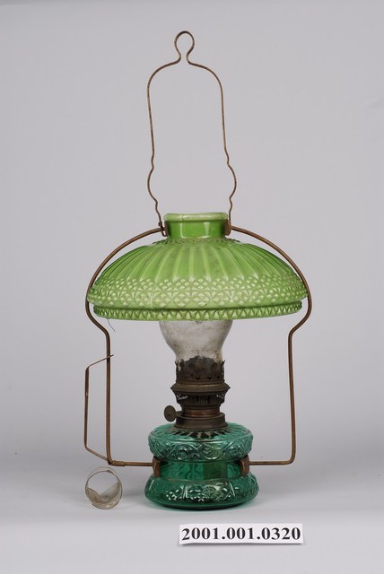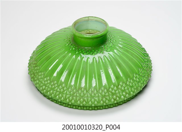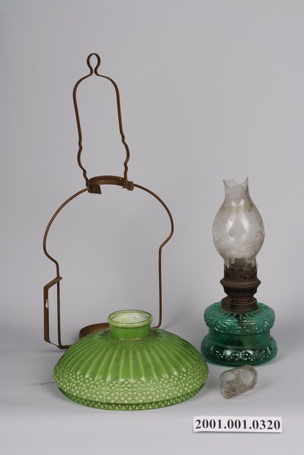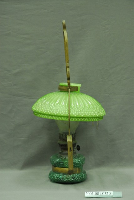 本件乳白綠玻璃煤油吊燈係以石油提煉之煤油作為燃料,以棉繩燈芯為燃燒媒材使用之燈具。煤油燈可分為吊掛支架、外罩、燈罩與煤油壺等部件。外罩以綠色玻璃內襯白底,外型作直口厚唇短頸之覆碗形,表面帶有幾何與線形花紋。燈罩為透明無色玻璃,呈長管鼓腹形,作防風功能,現已破損。油燈壺以綠色透明玻璃製成,壺身中段作帶狀束腰,上段為連枝草葉文,下段為幾何菱形紋。壺口上接金屬製油燈嘴,一側帶有細長旋鈕可挑整火光大小。吊掛支架以金屬製成,由上下2個C形金屬片橫向夾固外罩與油燈壺,吊掛支架可作提樑式懸掛,也可於單側壁掛使用。
