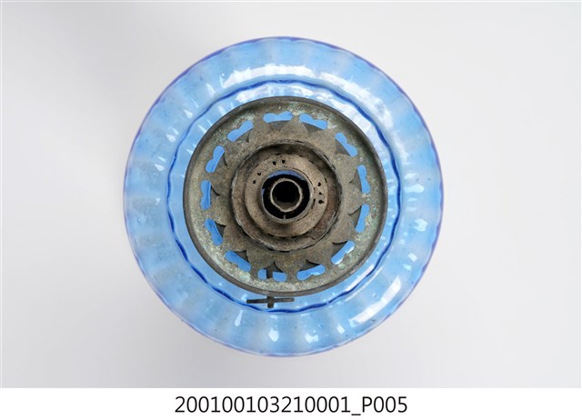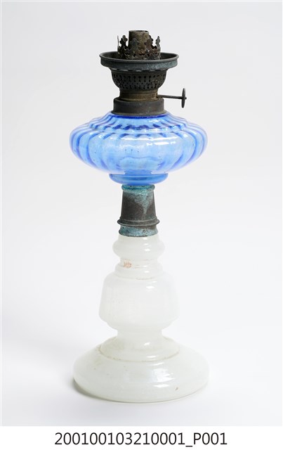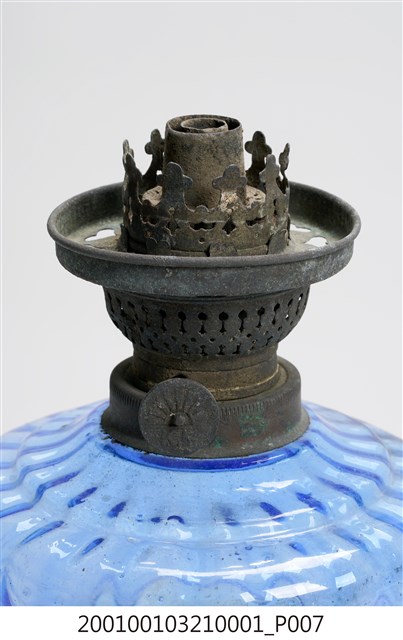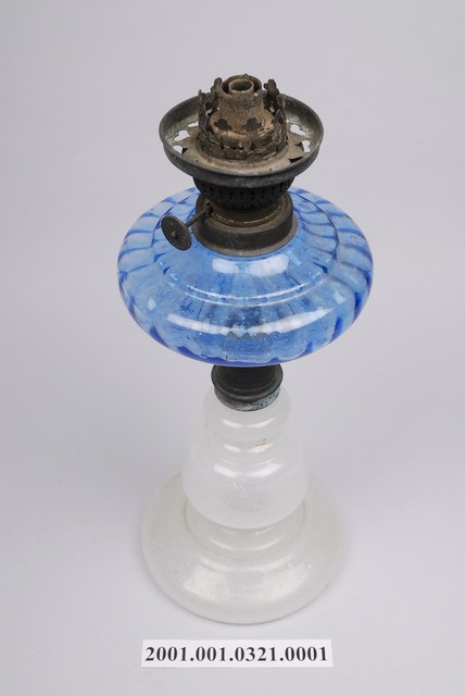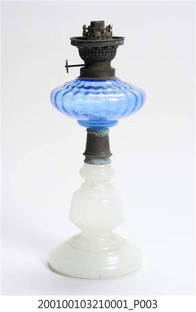 本件白底紅荷葉邊立柱式煤油燈壺座以玻璃與銅構件組合而成,煤油壺以藍色透明玻璃製成,壺身矮扁,鼓腹向下逐漸收斂,表面平滑,於內部作數道瓜稜紋,壺口上接金屬製油燈嘴,一側帶有細長旋鈕可挑整火光大小,燈芯燃燒處作一圓盤承作可置玻璃外罩。壺身底部以銅套筒續接白色半透明玻璃底座,底身帶有數道環形層次,呈上窄下寬之樣式。
