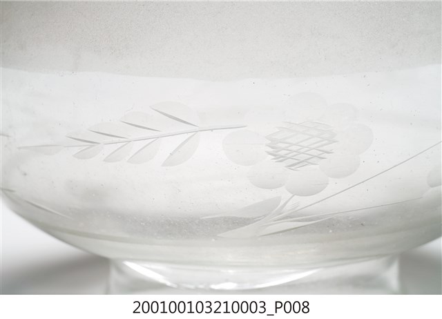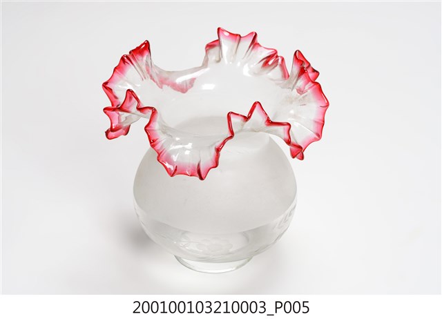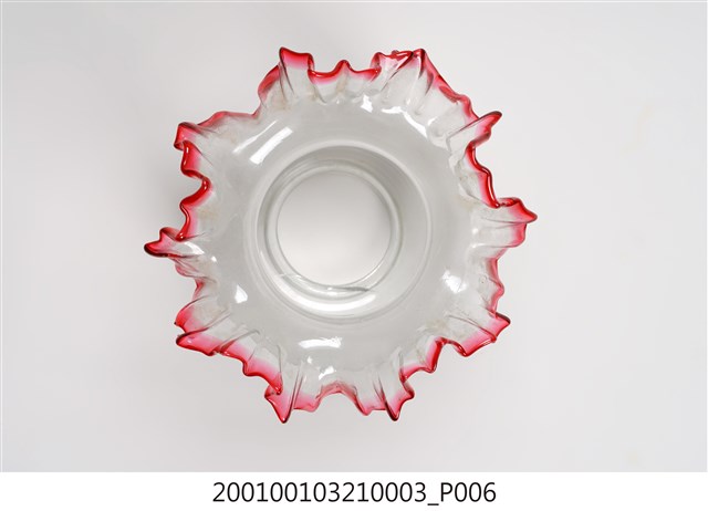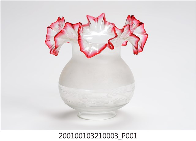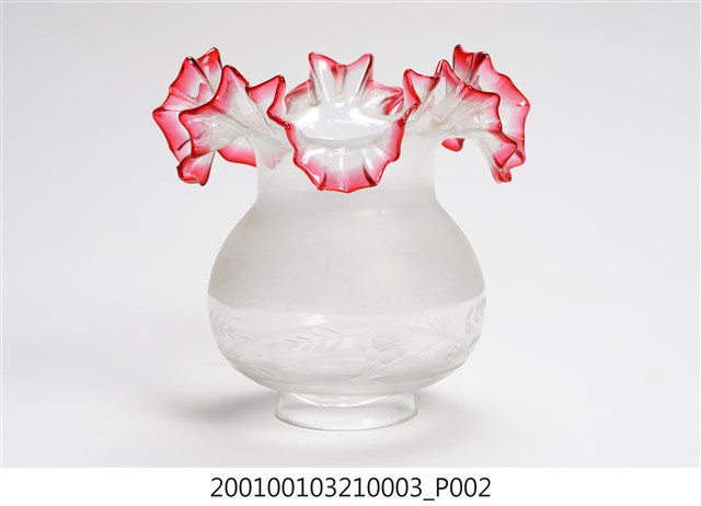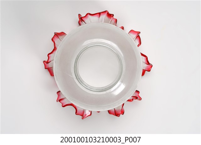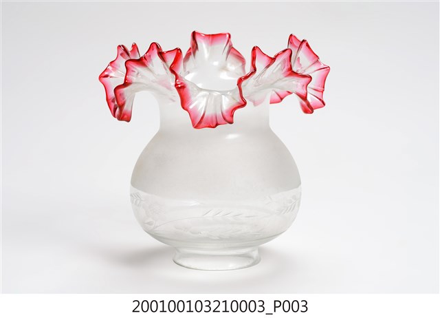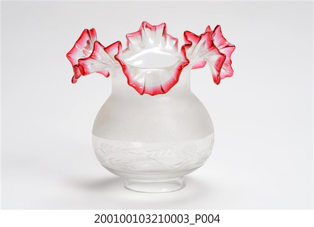 本件白底紅荷葉邊立柱式煤油燈外罩以透明玻璃一體成形製作,外型作上下開口,球型鼓腹,上開口外侈作褶裙荷葉邊,邊緣之玻璃帶紅色色澤。下開口作直口短頸,可置放於油燈嘴周圍承盤之上,器身上半段以磨砂工法形成半透明霧面質感,下半段同樣以磨砂工法,於表面形成枝葉圖紋。