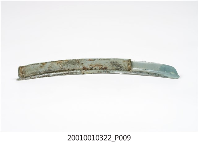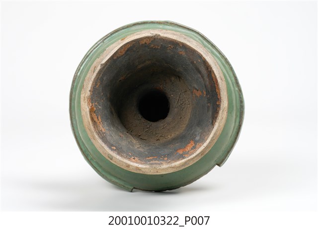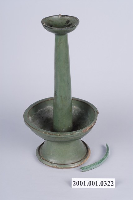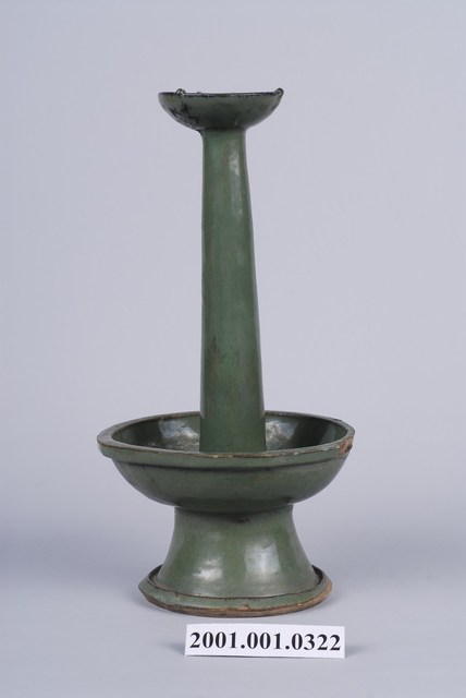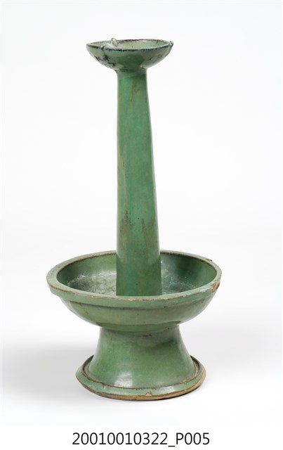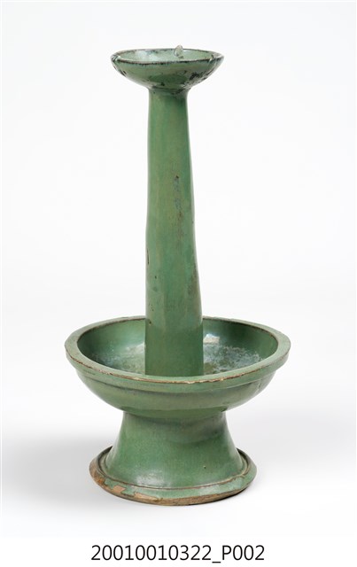 本件綠釉油燈為陶瓷材質。於表面施以綠釉燒製而成,外觀形似立柱狀燭臺,整體素面無飾。油燈頂端為碗狀小承盤,可盛裝燈油,承盤口緣於3端點有突起物,用以固定燈芯。承盤下接上窄下寬的圓柱型燈柱,續接大型的碗狀承盤,承盤下底接圓形高圈足,圓形圈足同樣呈上窄下寬貌,底緣作厚唇裝飾。