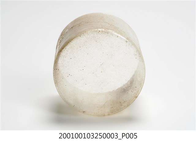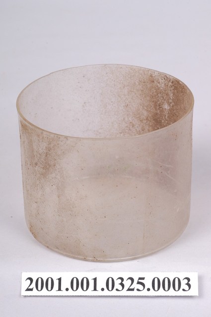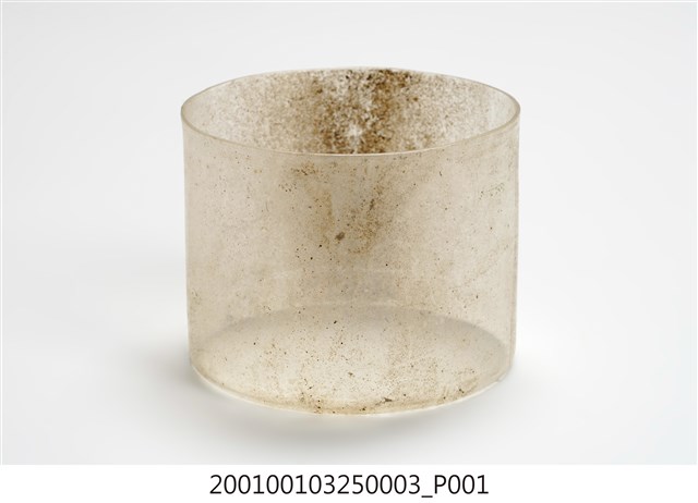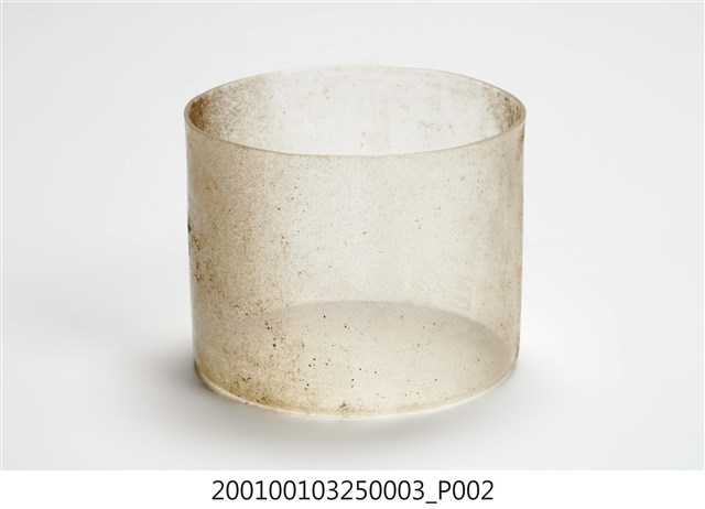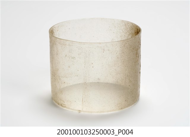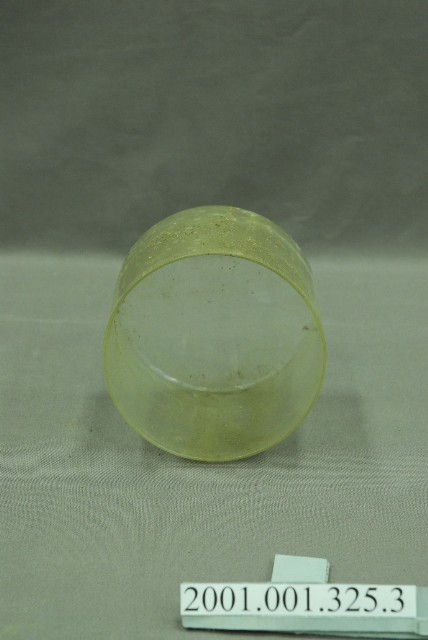 本件錏鉛製電石燈底座玻璃桶為部件之3,以透明無色玻璃製作而成,外型呈現平口平底之圓桶狀。玻璃桶主要放置於底座之內,用於裝盛電石,於上承接由上座點滴下來的水,在玻璃桶中進行反應。一般簡易型的電石燈直接放置電石於底座,內層以玻璃桶裝盛較為少見。