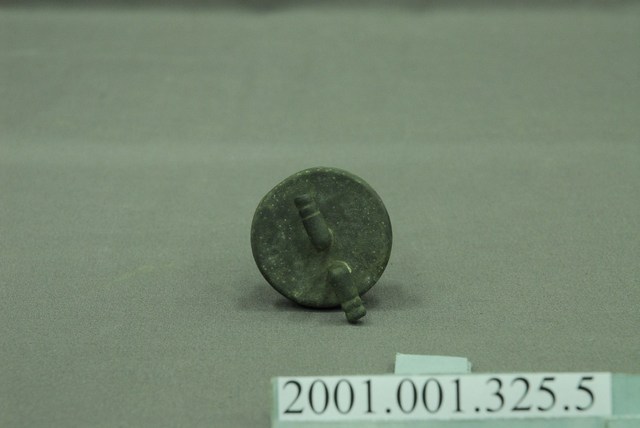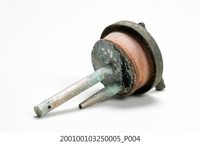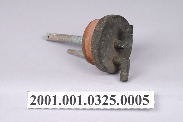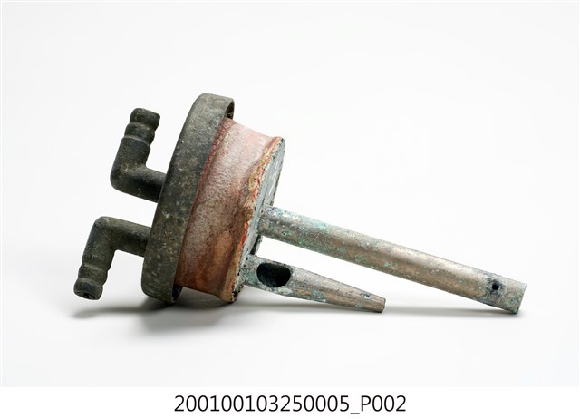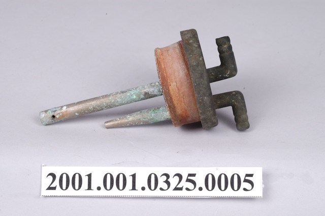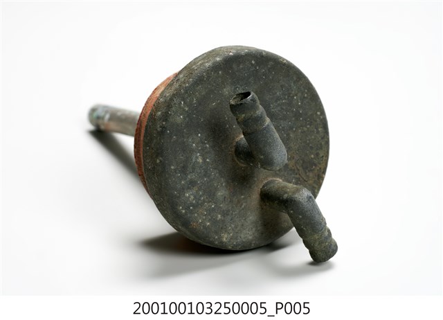 1.本件錏鉛製電石燈氣體洗滌瓶塞蓋為部件之5,圓形塞蓋上作2個相對之圓孔,蓋身為圓形扁狀之橡膠,於圓孔插入2支1長1短的L形金屬管,蓋頂作2個口緣朝外相對稱之倒L形。短金屬管尾端作尖嘴,且於接近塞蓋底端處之身側切有圓孔。長金屬管則末端封起,僅有底端兩側之小圓孔。2.氣體洗滌瓶之進氣口為長型管,頂端以軟管連接電石燈上座之出氣口,透過瓶內的水過濾電石因化學反應所帶有的雜質,也可純化氣體。經過過濾的乙炔氣體則會從短型管送出。