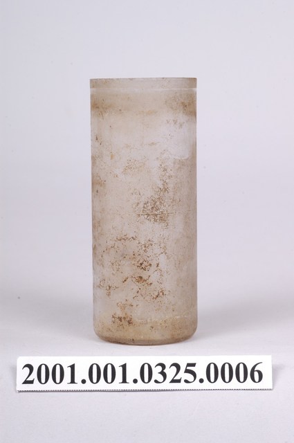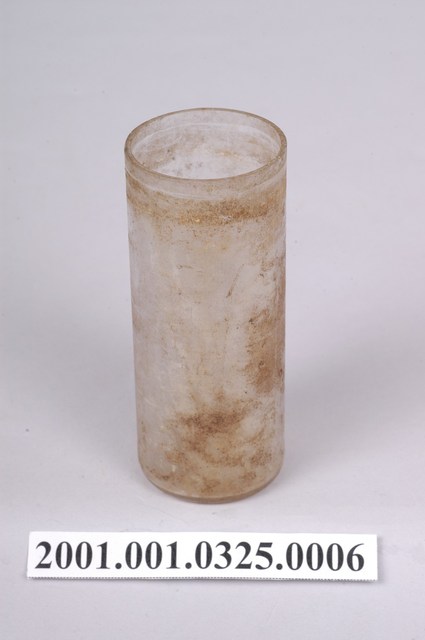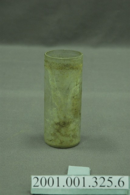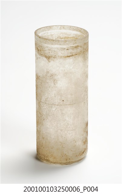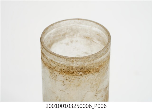 本件錏鉛製電石燈氣體洗滌玻璃瓶為部件之6,以透明無色玻璃製作而成,外型呈現平口平底之圓形長筒。玻璃瓶為氣體洗滌裝置之部件之1,主要裝盛過濾氣體需要的水, 電石遇水反應會產生乙炔氣體與氫氧化鈣物質,傳統的電石燈長久使用會因為雜質造成管路堵塞。本件電石燈多增加氣體洗滌裝置,過濾雜質純化氣體,減少管輅堵塞發生。