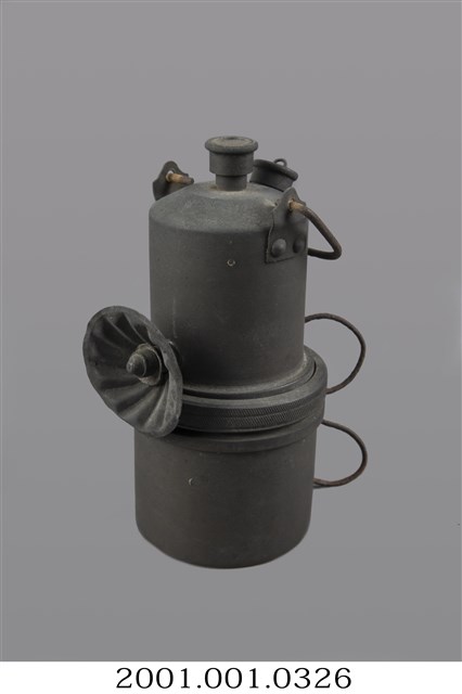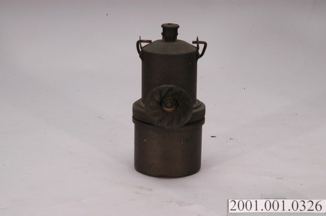 1.本件銅皮電石燈又稱電土火,以銅片製作而成,可分為上座與底座。上座略小於底座呈圓筒狀,正面底端有突出之噴火嘴,噴火嘴外有圓扇型反光罩,頂面中央帶有突出之圓形旋鈕,可調節滴落的水量,後方則作旋蓋式柱水口,並於兩側邊作耳連結環形提樑,其上帶有C形掛鉤。底座為略大之圓筒,主要裝盛電石,上座與底座之間接合以墊圈以及旋環緊密接合。2.臺灣早期在電燈尚未普遍的時代,係以油燈、蠟燭、電石等做為夜間照明工具。本件電石燈係以下座放置電石,又稱電土,為碳化鈣(CaC2),上座盛水,因水接觸到電土會釋放乙炔氣體,於噴火嘴點