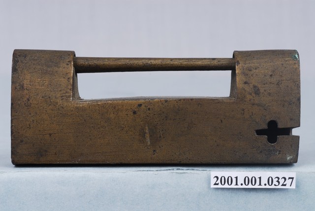 1.紅銅製橫式鎖具,又稱「廣鎖」,鎖頭上部呈三角形,下部呈正方形,外觀有氧化的現象,鎖頭側面有裂痕。本件為需要鑰匙開啟的簧片構造鎖,鑰匙孔開在正面和側面相鄰的兩個面上,屬於「定向鎖」,為必須將鑰匙頭的特定部份、以特定的方位與鑰鎖孔的特定位置接觸。2.金屬鎖的大量使用始於東漢,分為簧片構造鎖與文字組合鎖兩大類,常用於鎖門、鎖櫃、鎖箱、…等。簧片構造鎖構造分為鎖樑、鎖栓、彈簧片、鎖梗、鎖體、鑰匙。