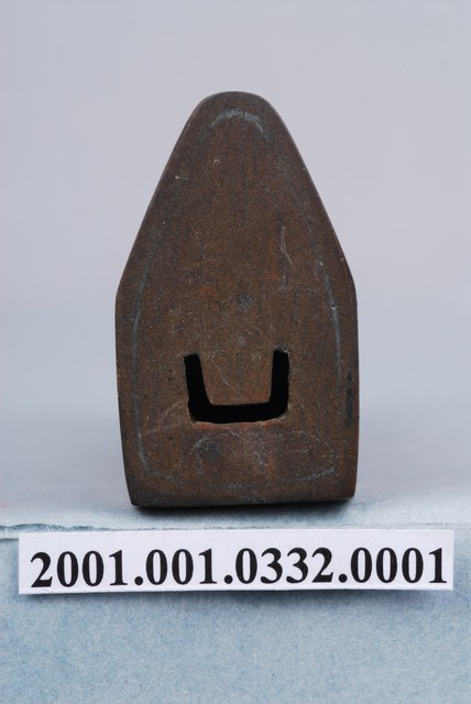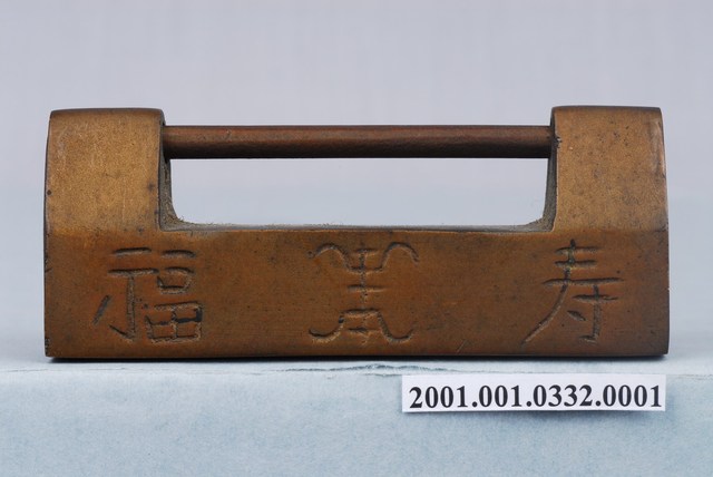 1.紅銅製橫式鎖具,又稱「廣鎖」,鎖頭上部呈三角形,下部呈正方形,外觀有氧化的現象,正面刻有「福」、「壽」字。本件為需要鑰匙開啟的簧片構造鎖,鑰匙孔開在側面,形狀為文字形「凵字」。2.金屬鎖的大量使用始於東漢,分為簧片構造鎖與文字組合鎖兩大類,常用於鎖門、鎖櫃、鎖箱、…等。簧片構造鎖構造分為鎖樑、鎖栓、彈簧片、鎖梗、鎖體、鑰匙。文字形鑰匙孔,其文字的選擇有使用身分限制,其複雜度是按官職遞增,亦有用於祈求健康或婚嫁而使用的文字。